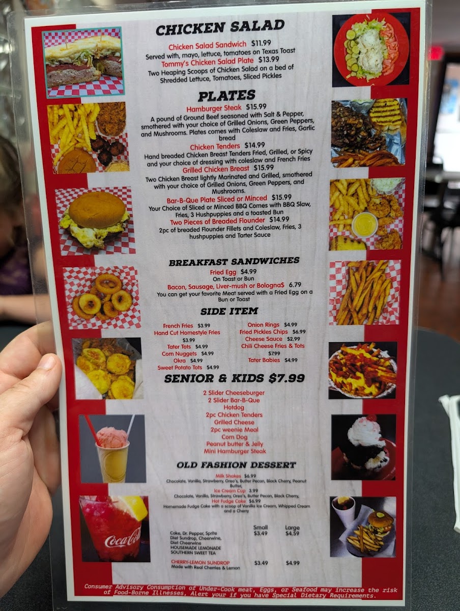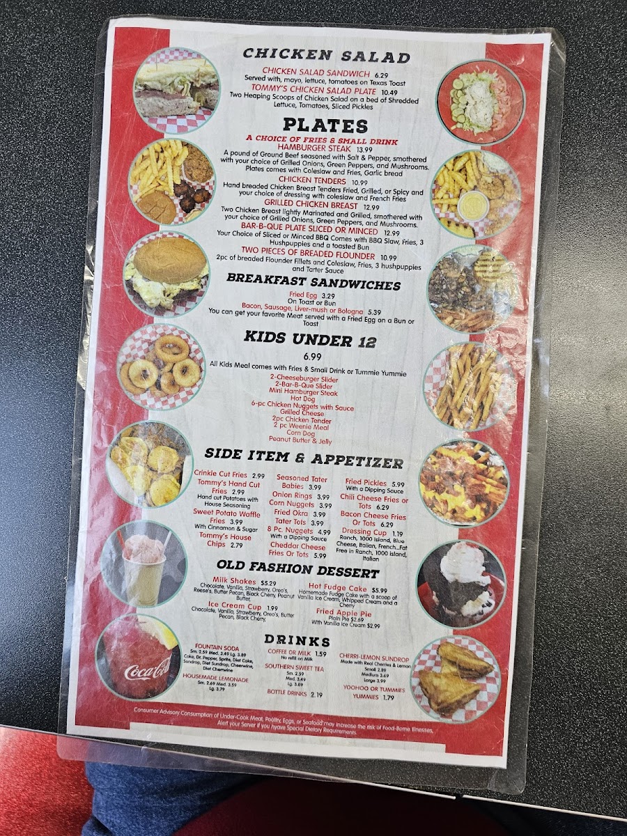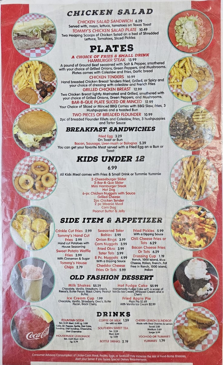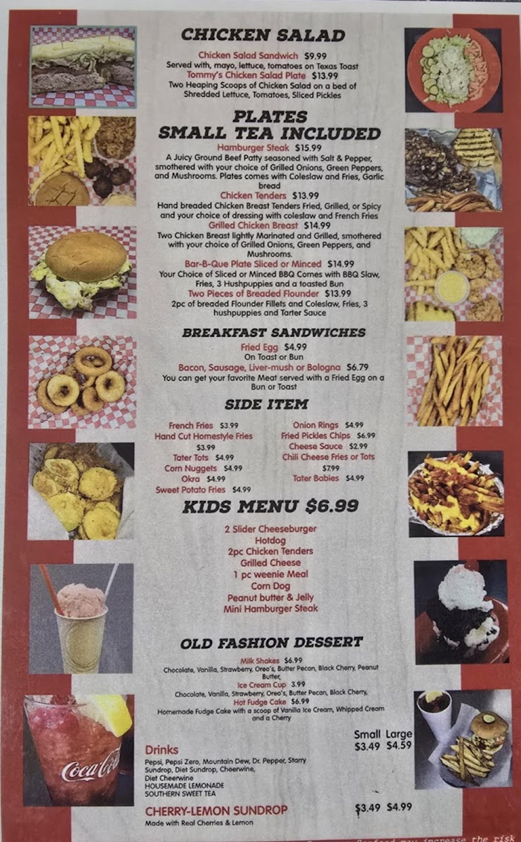 Beverages at Tommy’s are just as approachable, with sweet tea and lemonade in large servings to complement the meal, alongside classic soda options. Desserts like hot fudge cake, fried apple pie with vanilla ice cream, and strawberry shortcake offer a nostalgic finish, inviting guests to linger a little longer over something sweet.